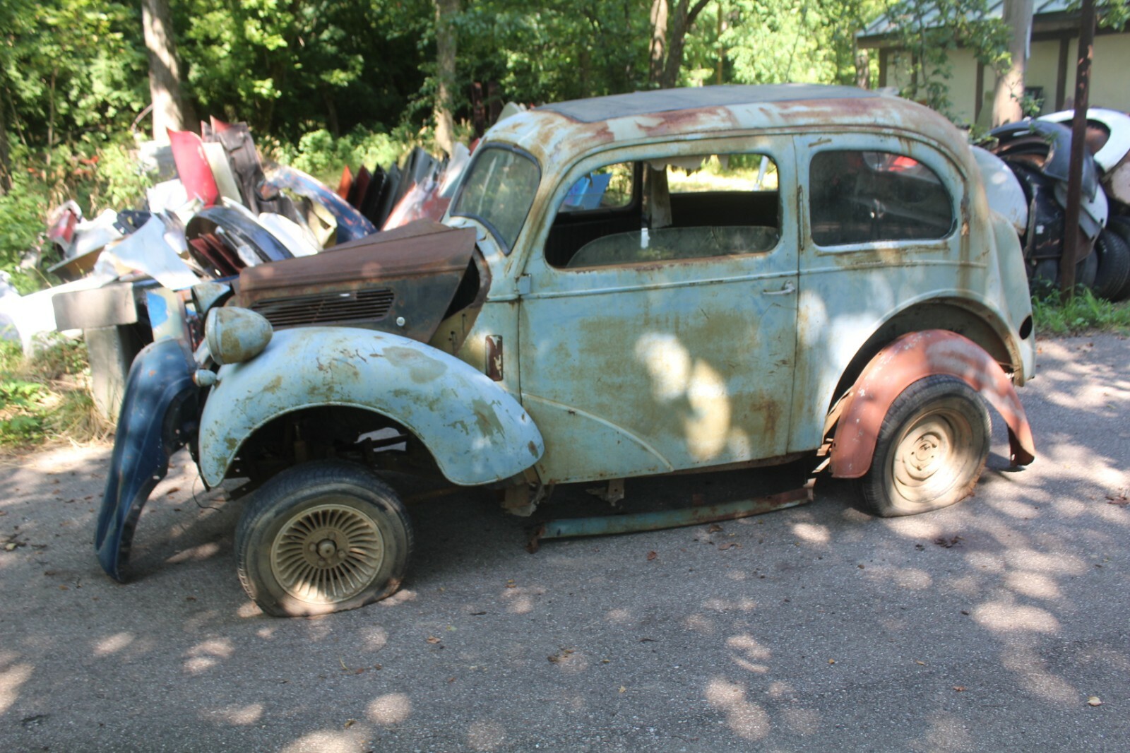 1948 ford anglia four door, 327 ci engine, 350 th trans, 8.8 ford rear end with ladder bar, coil over shocks, all steel body with fiber glass rear fenders.